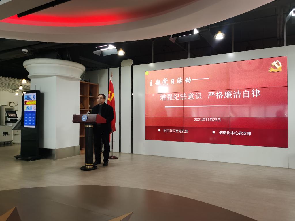 为贯彻落实全面从严治党要求,进一步增强党员干部廉洁自律意识,11月23日下午,招生办公室党支部与信息化中心党支部联合开展“增强纪法意识 严格廉洁自律”主题党日活动。两个支部全体党员及部分教职工参加学习,活动由招生办公室党支部书记黄健新主持。