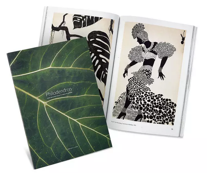 拿《蔓绿绒:从拉丁文的异国情调到美式现代风格》(Philodendron: From Pan-Latin Exotic to American Modern)来说,这本书是去年华夫索尼亚-佛罗里达国际大学(Wolfsonian–FIU)博物馆举办的热带植物社会历史展览上展出的手册。整个封面是一片树叶的局部,涂层触感柔软,加以多层压花,纹理细节逼真,无论着视觉还是触觉上都跟一片真的蔓绿绒叶子相同。