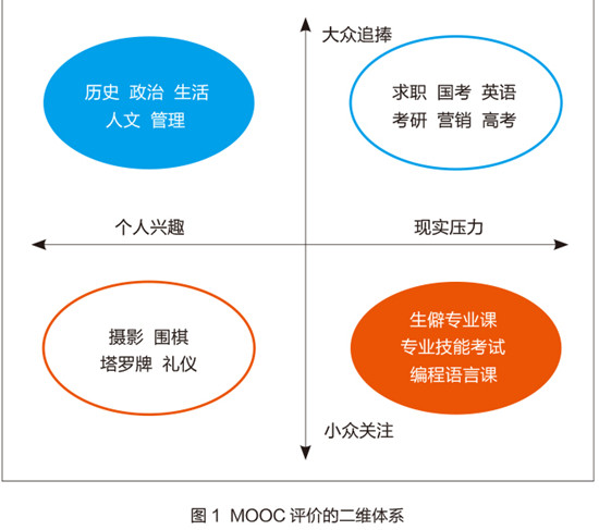 这四类的MOOC不宜用采相同的评价体系。偏个人兴趣的MOOC,用户往往是随机进入这些课程,前几期的点击率很高,在没有硬性课程考试和时间压力的情况下,多数用户不会坚持到课程结束,这些课程需要有特色、有观点、风趣、博学、耐人寻味等。而偏现实压力的MOOC,如高校由原精品课程和专业课程转型的MOOC,需要学生注册后,在学期内配合传统课程学习,完成作业和考试并获得成绩;或者是需要由培训通过国家或行业类考试;这类MOOC强调课程体系、逻辑架构和专业性,需要用户反复学习和相互讨论后才能掌握,课程难度较高,一般而言,用户更愿意为这类MOOC付费。