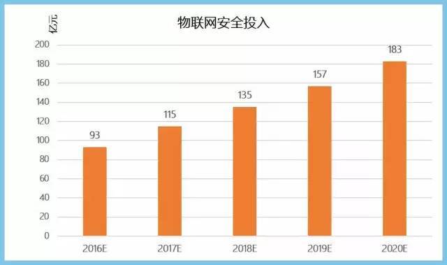 在中国市场,安全投入尚不足IT投入的2%。根据CEDA的研究,2016年中国物联网产业规模预计达到9300亿元,到2020年将接近18300亿元。按照保守比例1%计算,中国物联网安全在2016年达到93亿元,2020年达到183亿元。