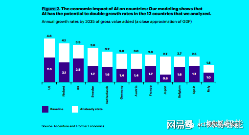 人工智能对国家的经济影响:我们的模型显示,在我们所分析的12个国家中,人工智能都有可能在2035年前使毛附加值的年增长率翻倍(毛附加值通常用于估算一个国家的GDP)。