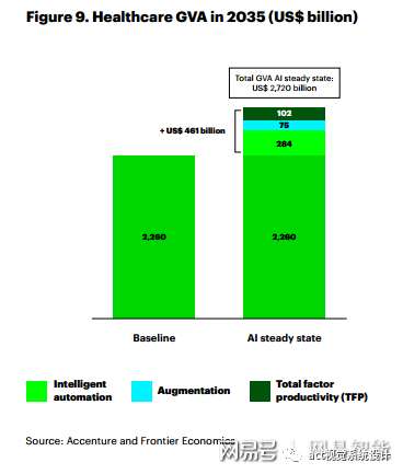 医疗保健行业:在模型中,人工智能将在2035年将医疗保健行业的增长率从2.2%提高到3.4%,这将额外增加4610亿美元的GVA。智能自动渠道占了其中的60%以上,人工智能系统可以分析大量的非结构化数据,并产生预测诊断,在它们成为严重的健康风险之前就能检测出问题。创新渠道到2035年会为行业增加超过1000亿美元的资金。有一个关于人工智能在医疗方面的巨大潜力的例子是该行业与相关领域合作,比如说制造业和设计行业,通过合作为器官移植创造了最尖端的3D打印技术。
