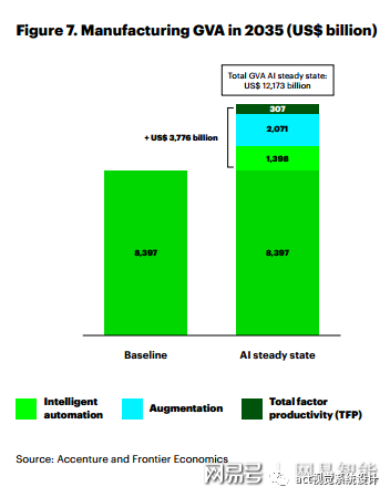 这是2035年实际年总增长值(GVA)的增长率(%)人工智能可以大幅提高工业的经济产量,仅对制造业而言,人工智能在2035年就能使总增长值(GVA)增长近4万亿美元。