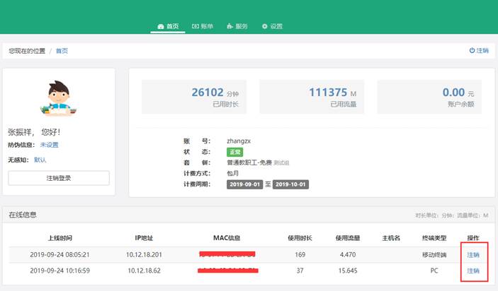 登录后页面上会显示在线终端的列表(如下图),对应终端的“注销”链接,即可将终端下线。