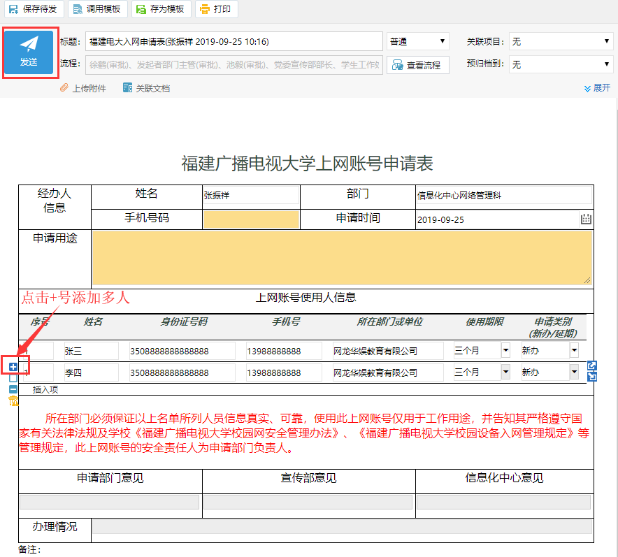 4. 在弹出的申请表中填写相关信息,点击【发送】按钮即可。若需要为多人申请,请点击页面上的“+”号添加更多人员,如下图。