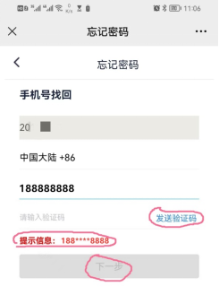 3、 输入您的绑定的手机号,点击获取验证码后,输入您收到的6位数的验证码,并点击下一步。