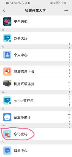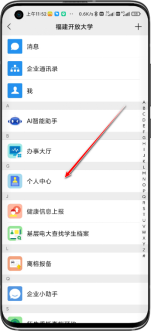 方法2(微信端):按照附件2,关注学校的微信企业号后,打开“微信”,在通讯录中点击“福建开放大学”。进入个人中心。