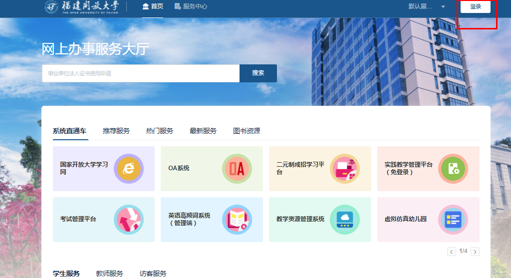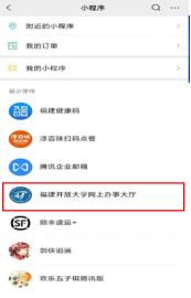 1、在微信中搜索“福建开放大学网上办事大厅”小程序,进入网上办事服务大厅。
