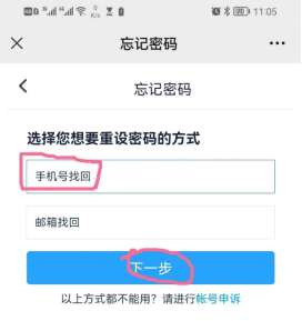 4、点击“手机号找回”,点击【下一步】,如下图: